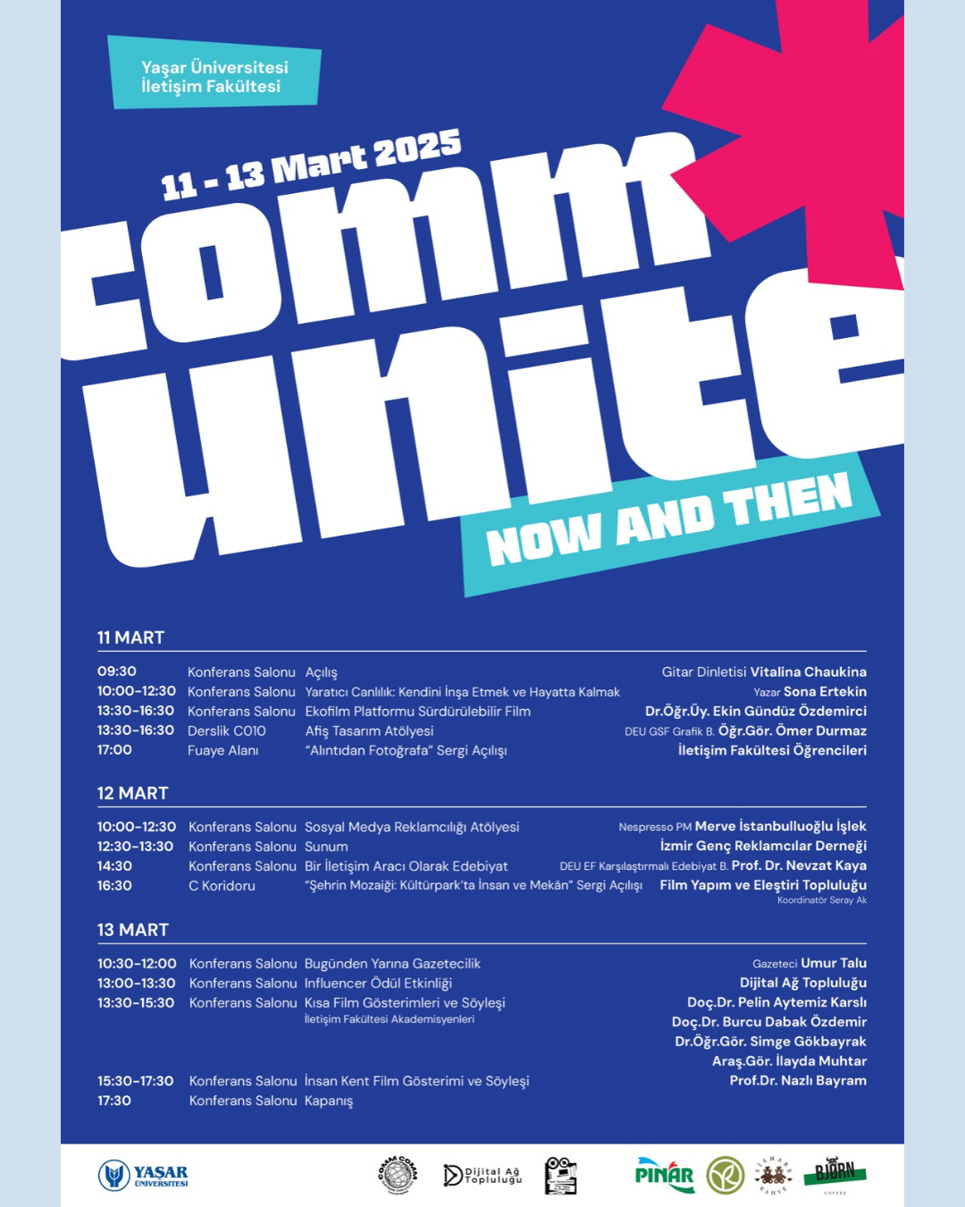 11-13 Mart 2025 tarihleri arasında Yaşar Üniversitesi İletişim Fakültesi tarafından düzenlenen COMM*UNITE “Now and Then” etkinliğine EkoFilm Sürdürülebilir Yapım Platformu olarak katıldık. İletişim fakültesinde okuyan ve bu alana ilgi duyan öğrenciler ile alanında uzman konukların buluştuğu bu etkinlik çeşitli atölyeler, film gösterimleri, söyleşiler ve sergilerle dolu bir deneyim sundu.