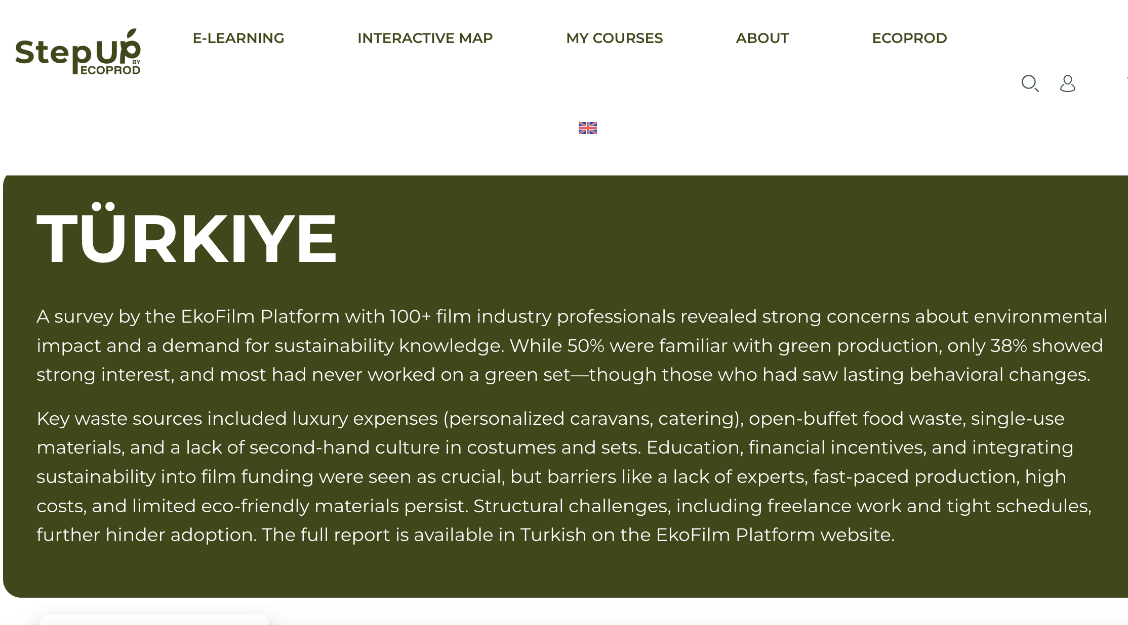 StepUP’da yer alan interaktif haritada ülkelerin sürdürülebilir yapım uygulamaları, finansal teşvikler ve yönetmelikler hakkında detaylı bilgiler bulunuyor. EkoFilm Platformu’nun hazırladığı Türkiye içeriğinde de, platformun çalışmaları ve yerel uygulamalar ile birlikte sürdürülebilirlik odaklı ulusal mevzuat ve sektöre özgü teşvikler gibi veriler yer alıyor.